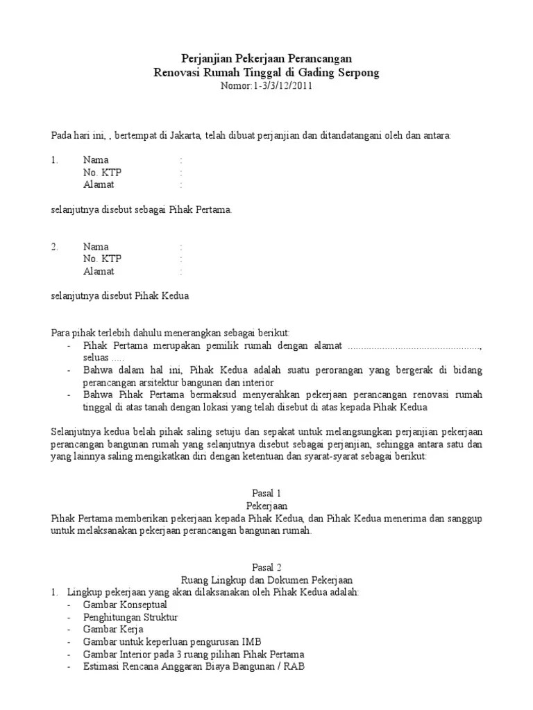 Contoh surat perjanjian kerja sama, jual beli tanah, kontrak dan sewa rumah, serta utang piutang yang bisa dijadikan referensi. Pembuatan surat kontrak kerja proyek juga bertujuan supaya kedua belah pihak mengetahui hak dan kewajibanya. Kalau terjadi perselisihan, penyelesaiannya dilaksanakan secara kekeluargaan. 25 contoh surat perjanjian renovasi rumah tinggal gif. Paragraf 2 persyaratan proposal bantuan pembangunan rumah susun pasal 8 (1) persyaratan proposal sebagaimana dimaksud dalam pasal 7 huruf a terdiri dari: