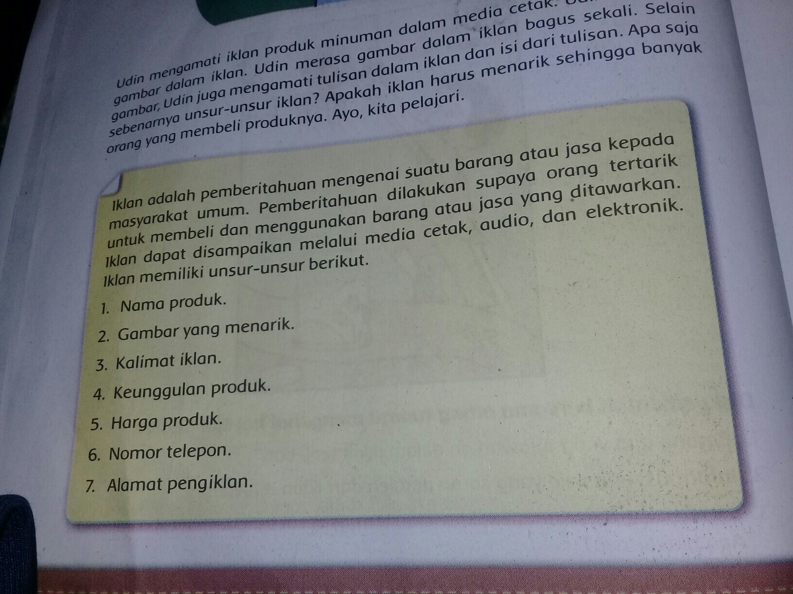 pada gambar 1 menunjukkan iklan tentang mie instan. unsur unsur, ciri struktur, jenis dan tata cara. Keberhasilan suatu iklan ditentukan oleh seberapa menarik jasa atau iklan tersebut ditawarkan. Bovee, iklan ialah suatu hubungan non individua yang umunya berbayar dan karakternya persuasif mengenai suatu produk ataupun jasa dari promotor yang dimuat dengan beragam media. Demikianlah portingan mengenai kunci jawaban halaman 29, 30, 31, 33 kelas 5 tema 9 buku tematik siswa.